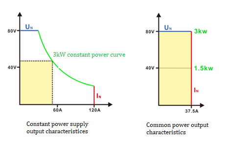 Constant power supplies offer a wider output voltage and current range compared to ordinary power supplies. A single model can meet the testing needs of customers with various product specifications. The voltage and current output of a power supply are limited by its maximum power rating; reducing the output current can achieve a higher voltage, or vice versa, making it more flexible than traditional "matrix" power supplies. (See diagram below.)